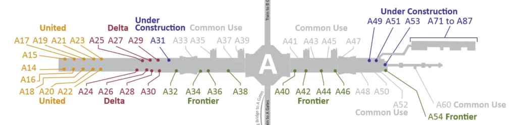 A14–A87 | – West side: Delta, Frontier, common-use gates – East side: United (some gates, e.g., A14–A23), other airlines |